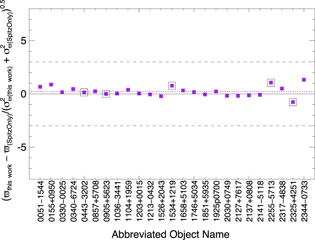 Comparison of the astrometric results from this paper to special astrometric runs for which the ancillary unWISE data are not used, for the 25 objects (purple squares) in common between this work and Gaia DR2. Mean offsets along the y-axis are shown by the dotted purple line; dashed black lines show 3σ excursions. Objects with ﹩{\chi }_{\nu }^{2}﹩ values of 1.5 or greater are ringed by an open square and are not included in the computation of the mean.