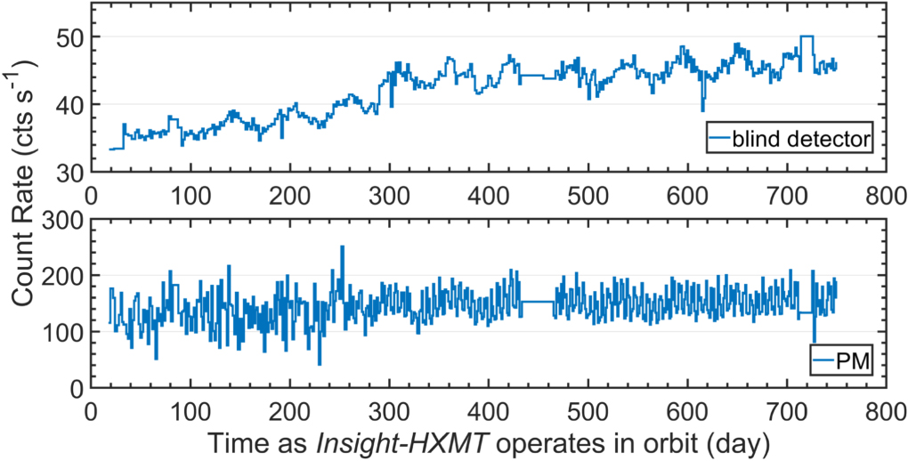 The evolution of the HBD count rate over time. The HBD count rate (top) increases while the count rate of PMs (bottom) remains unchanged, suggesting that this change is contributed by a long-term decay component and not the prompt component or a short-term decay component.