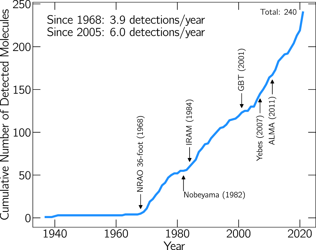 Cumulative number of known interstellar molecules over time. After the birth of molecular radio astronomy in the 1960s, there have been on average 3.9 new detections per year. The commissioning dates of several major contributing facilities are noted with arrows.