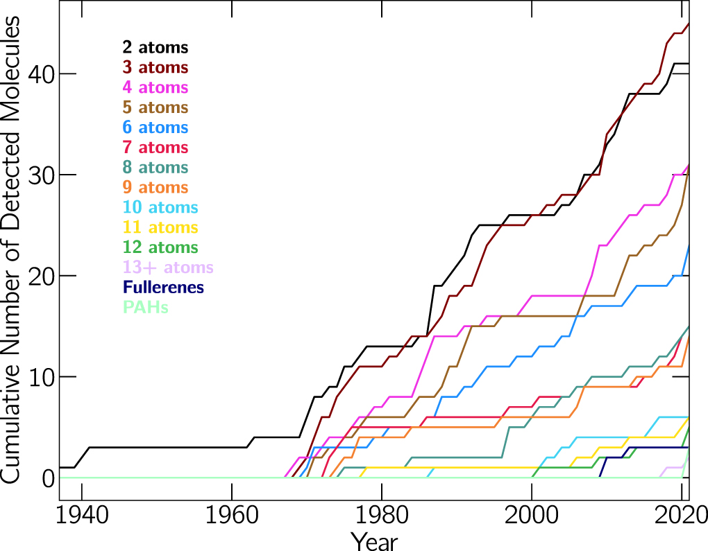 Cumulative number of known interstellar molecules with 2–13 atoms, as well as fullerene molecules, as a function of time. The traces are color coded by number of atoms and labeled on the right.