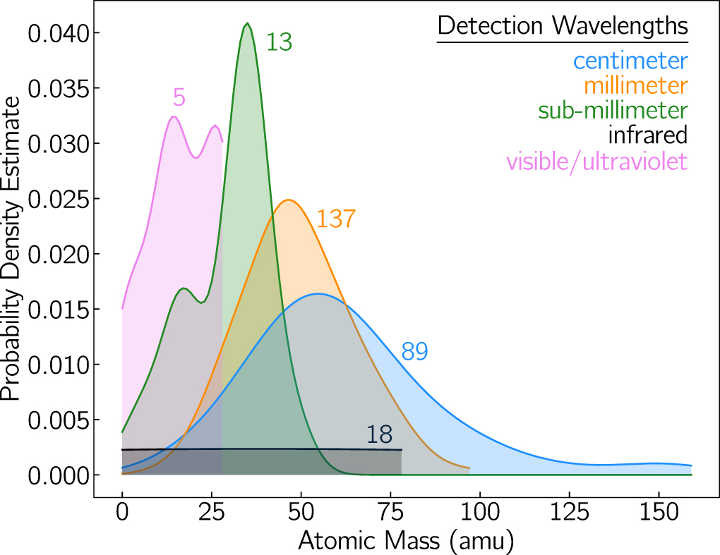 Kernel density estimate (KDE) analysis of molecules detected in each of the given wavelength ranges (excepting the fullerenes), generated with a bandwidth = 0.5. In some cases, the initial detection was reported in two or more wavelength ranges (see text), and credit was given to each for this analysis. The number of samples in each wavelength range is given next to the corresponding trace in the plot. The frequency ranges for centimeter, millimeter, and submillimeter used were 0–50, 50–300, and 300+ GHz, respectively.