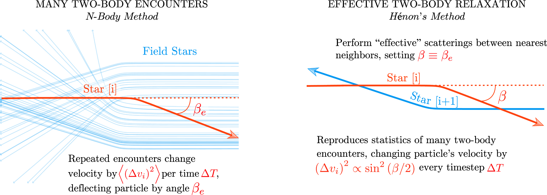 Schematic diagram of the Hénon method. The cumulative velocity change due to many two-body encounters in a realistic cluster can be calculated given the average local mass, velocity, and density of stars with Equation (9). In Hénon’s method, this is reduced to a single encounter between nearest-neighbor particles, where the deflection angle is chosen to reproduce the statistical predictions using Equation (12).