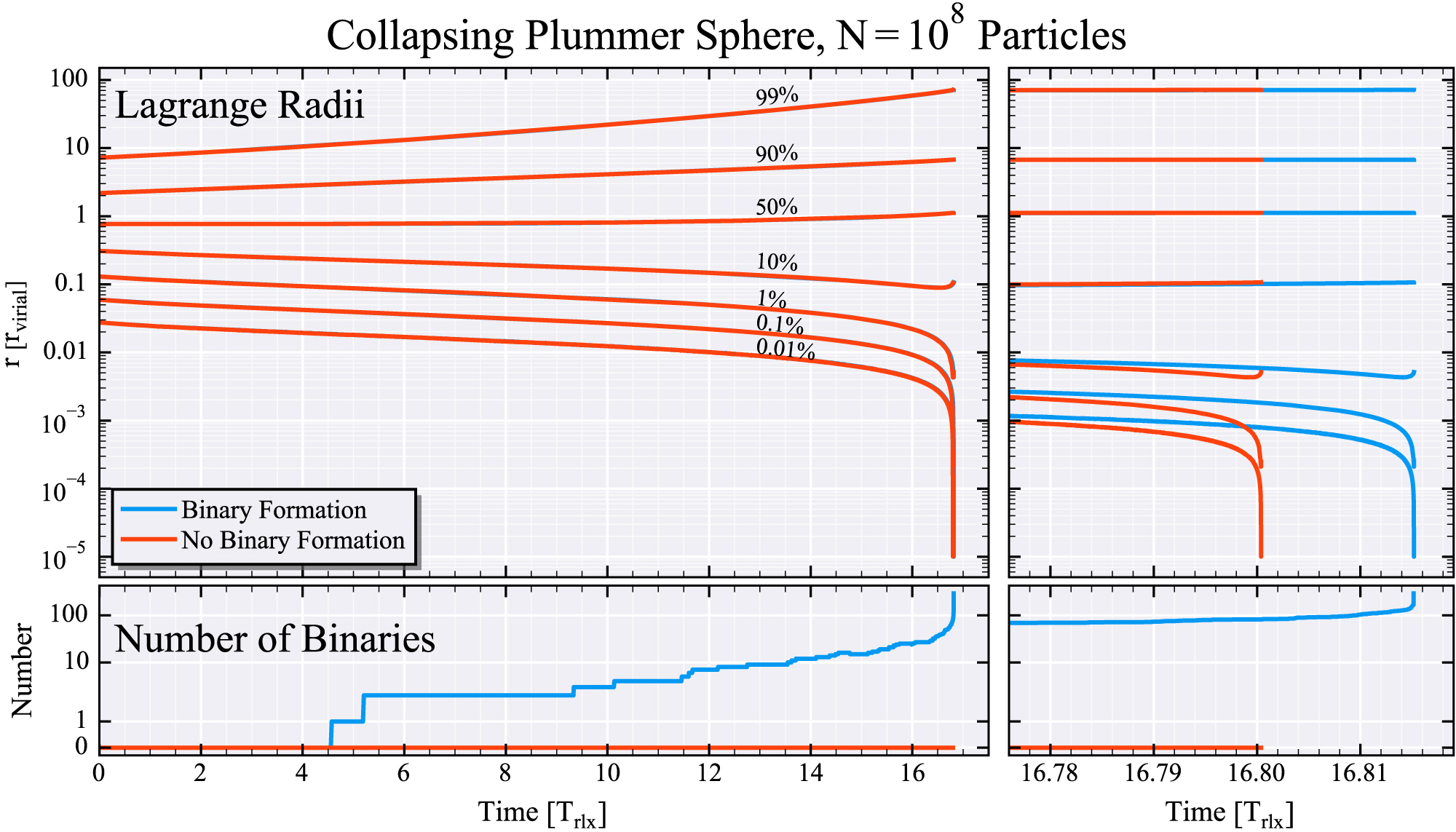 The Lagrange radii (radius enclosing a given fraction of the mass) and number of binaries as a function of the initial half-mass relaxation time for the two N = 108 particle realizations of a Plummer sphere. We show in red the model without three-body binary physics, and in blue the same model, but allowing binaries to form from single stars. On the top, we show the Lagrange radii as a function of time, with the distinction between the core and halo rapidly developed owing to two-body relaxation. On the top right, we zoom in at the final moments of core collapse (defined as having less than 1000 objects in the core) and clearly show the (minor) delay in core collapse caused by binary heating in the cluster core. On the bottom, we show the number of binaries formed over time. As the core shrinks, the central encounter rate increases, dramatically increasing the number of binaries in the cluster in the final moments before collapse.