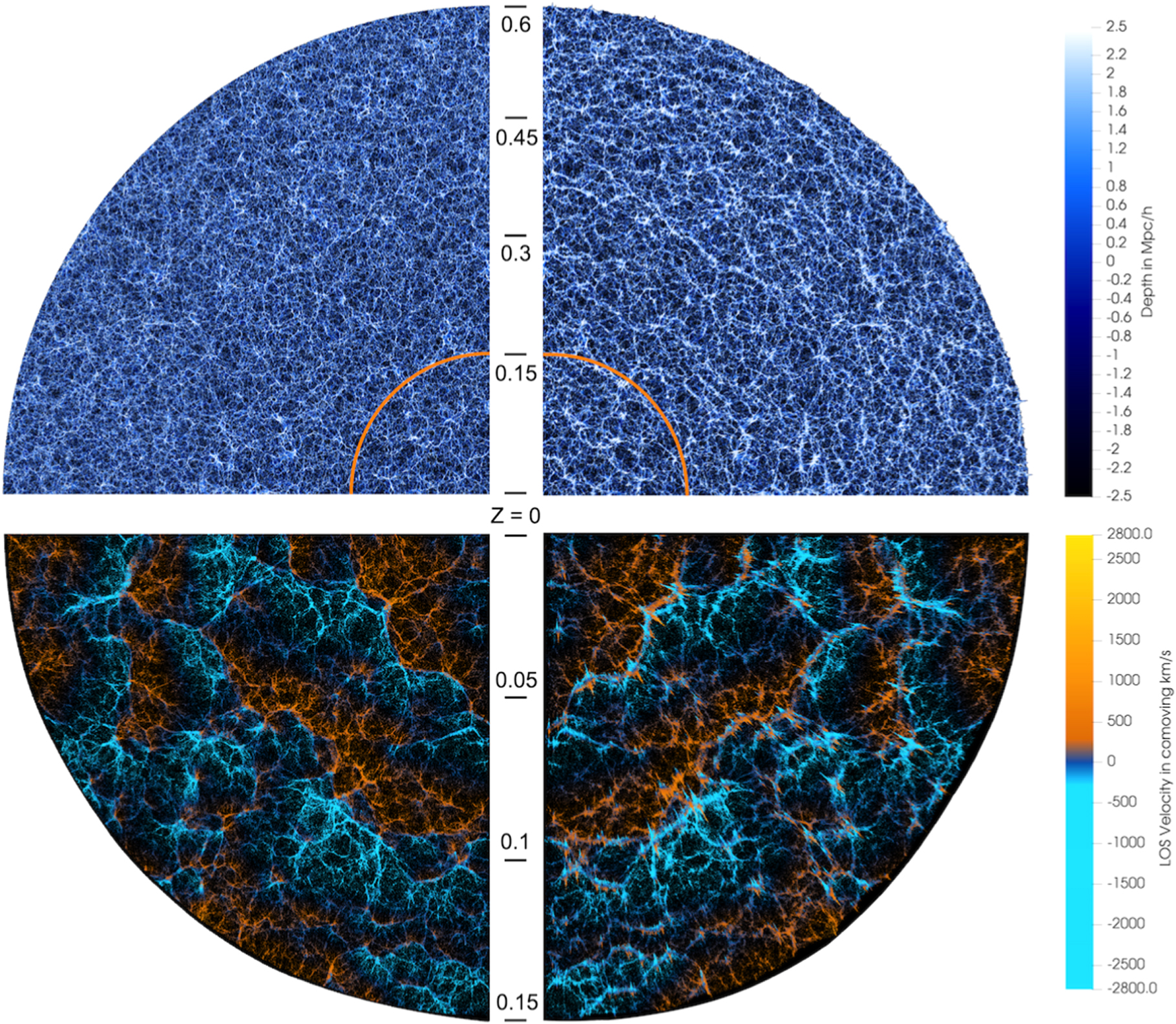 Visualization of the particle light cone data out to z = 0.6 (upper panels) and a zoom-in to z = 0.15 (lower panels). The orange curve in the upper panels shows the z = 0.15 boundary. The color in the upper panels represents depth in the disk of particles (in Mpc h−1). In the lower panels, color represents LOS velocities (in comoving km s−1). The left panels render the comoving particle positions while the right panels demonstrate the so-called Fingers of God effect from redshift space distortion.