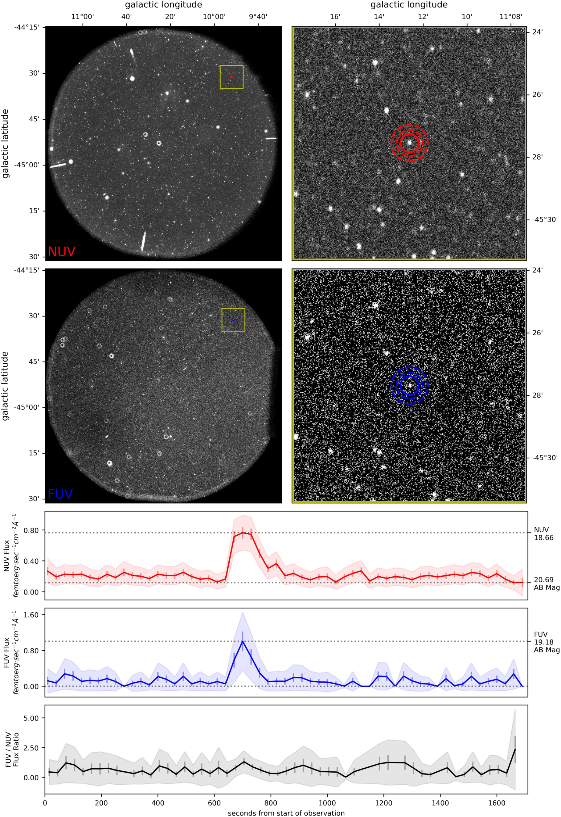 This flare on GUVV J004347.7-445130.7, observed once in GALEX eclipse 7500, is the highest-energy flare known to have been observed by GALEX. The top left image is the GALEX NUV full-frame image, with the subframe indicated appear in the top right. The images below it are the corresponding FUV full-frame and subframe images. The solid circles in the subframe images indicate the 17.″5 aperture; the dashed lines correspond to 25″ and 35″ radii apertures, used for background calculations. The first plot (red line) is the NUV lightcurve with 30 s bins; the axis on the left is in flux units and the minimum and maximum AB mag values are indicated on the right. The second plot (blue line) is the FUV lightcurve with 30 s bins. The bottom plot (black line) is the FUV/NUV flux ratio (unitless).