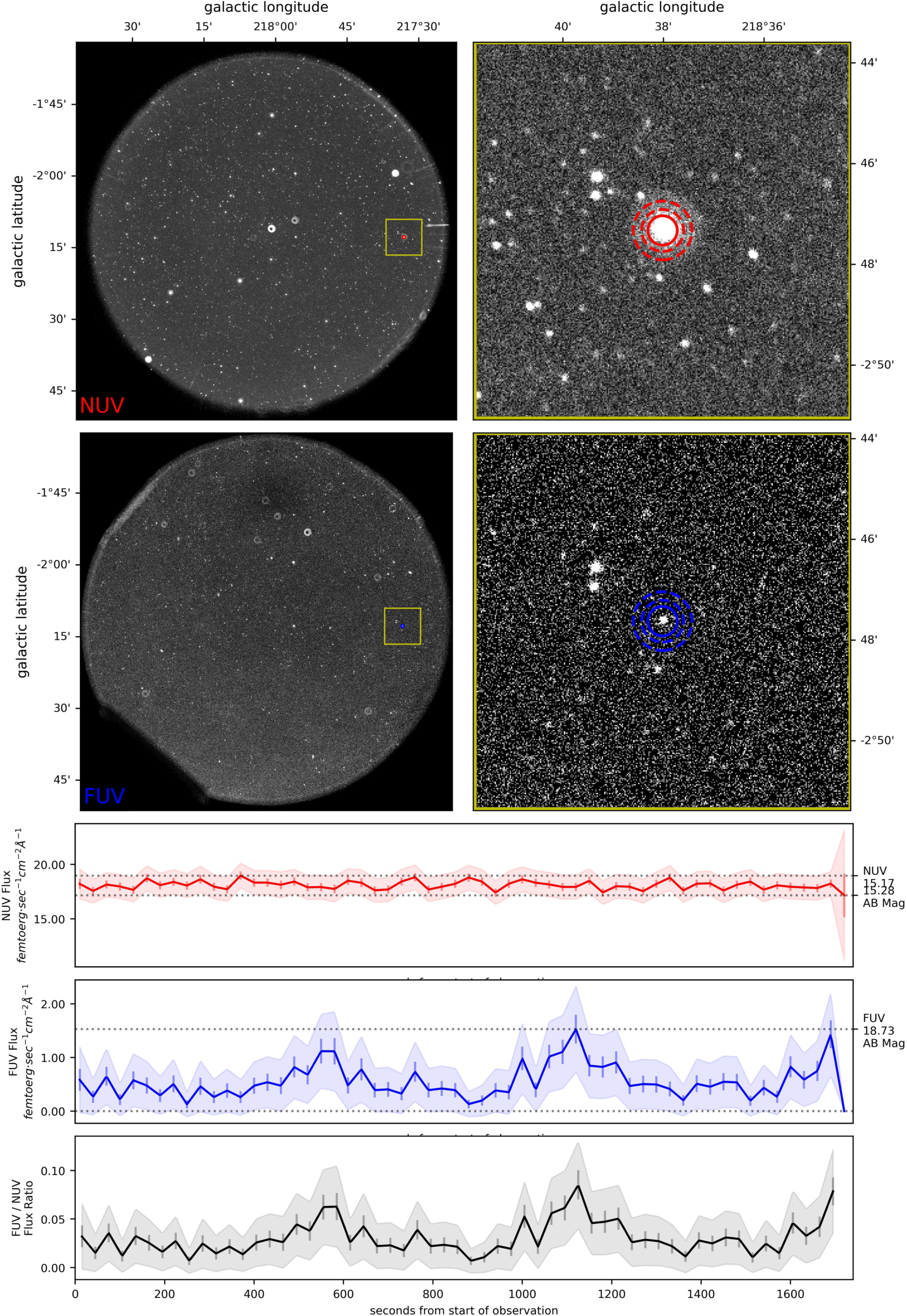 Typically, throughout GFCAT, when a source is detected in both bands, it also exhibits variability in both bands. GFCAT J143012.3-021249.2, with one dual-band observation in GALEX eclipse 26691 shown in Figure 7 is a rare case in which the FUV band shows significant variability and the NUV band—with a very significant detection—shows none. Refer to the capture of Figure 4 for a description of the plot layout.