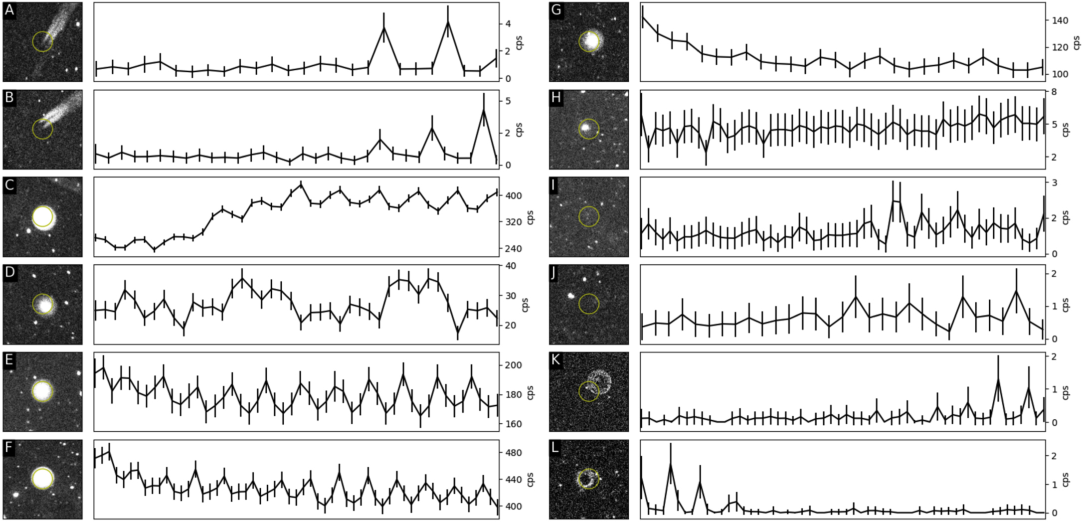 These are examples of “dither-synchronous” artifacts, which exhibit periodic signals consistent with the ≈120 s period of the MIS dither pattern. The time bins are 30 s and flux units are counts per second within a 17.″5 aperture, with 3σ error bars. The thumbnail images are 5′ across; the circles in the thumbnails are just graphical indicators, not photometric apertures. Examples A and B show “edge” reflections. Examples C–G are all bright sources triggering nonlinear response in the detector. Examples H–J show a variety of dither-like modulations on low signal or noise. Examples K and L are examples of unmasked hotspots in the FUV detector.