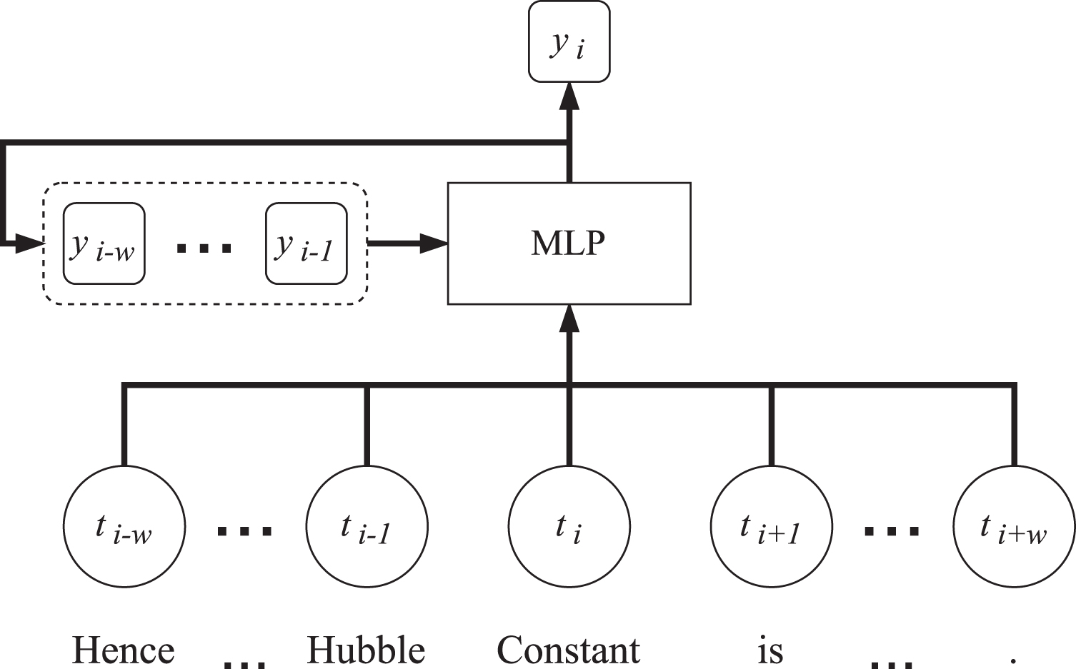 A schematic diagram of the feed-forward Entity model, where t n indicates the nth token embedding, y n indicates the model output for the nth token, and w is the window width.
