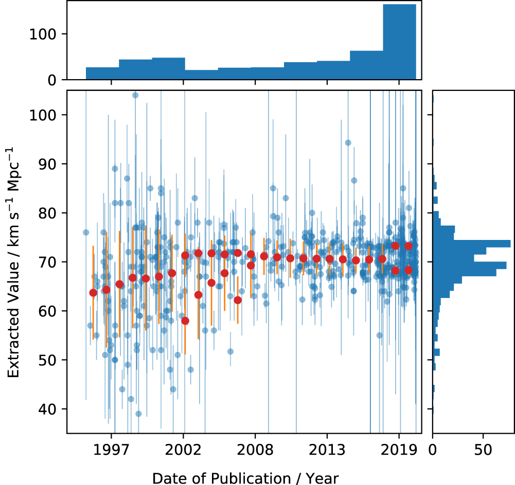 Time series of the search results for H 0, showing reported value against publication date (blue), along with the mean (red points) and dispersion (error bars) of the fitted Gaussian distributions for overlapping 5 yr periods.