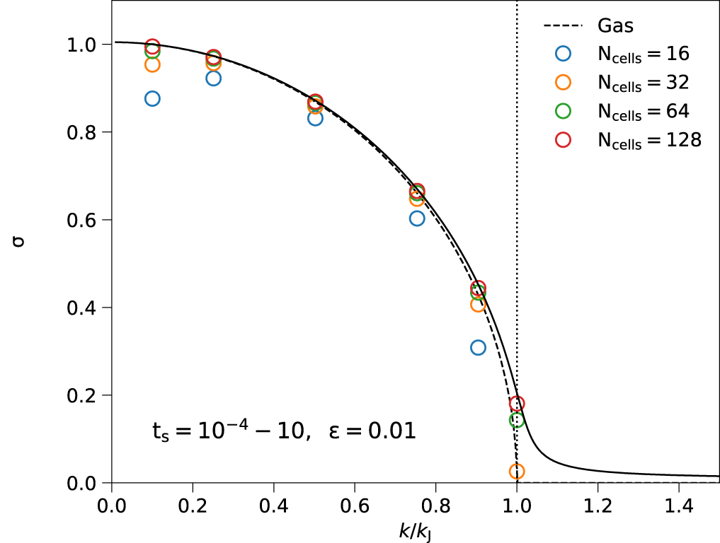 Test resolution convergence for Jeans instability including drag forces. The dashed line denotes the analytic solution for only gas. The solid line shows the analytic solution for 128 fluids including gas and dust species with a linear distribution from t s = 10−4 to 10 and uniform density distribution with a total dust-to-gas ratio ϵ 0 = 0.01. The open circles indicate that the numerical solutions for different numbers of cells converge to the solid line. The vertical dotted line indicates ﹩k/{k}_{{\rm{J}}}=1/\sqrt{1+{\epsilon }^{0}}﹩.