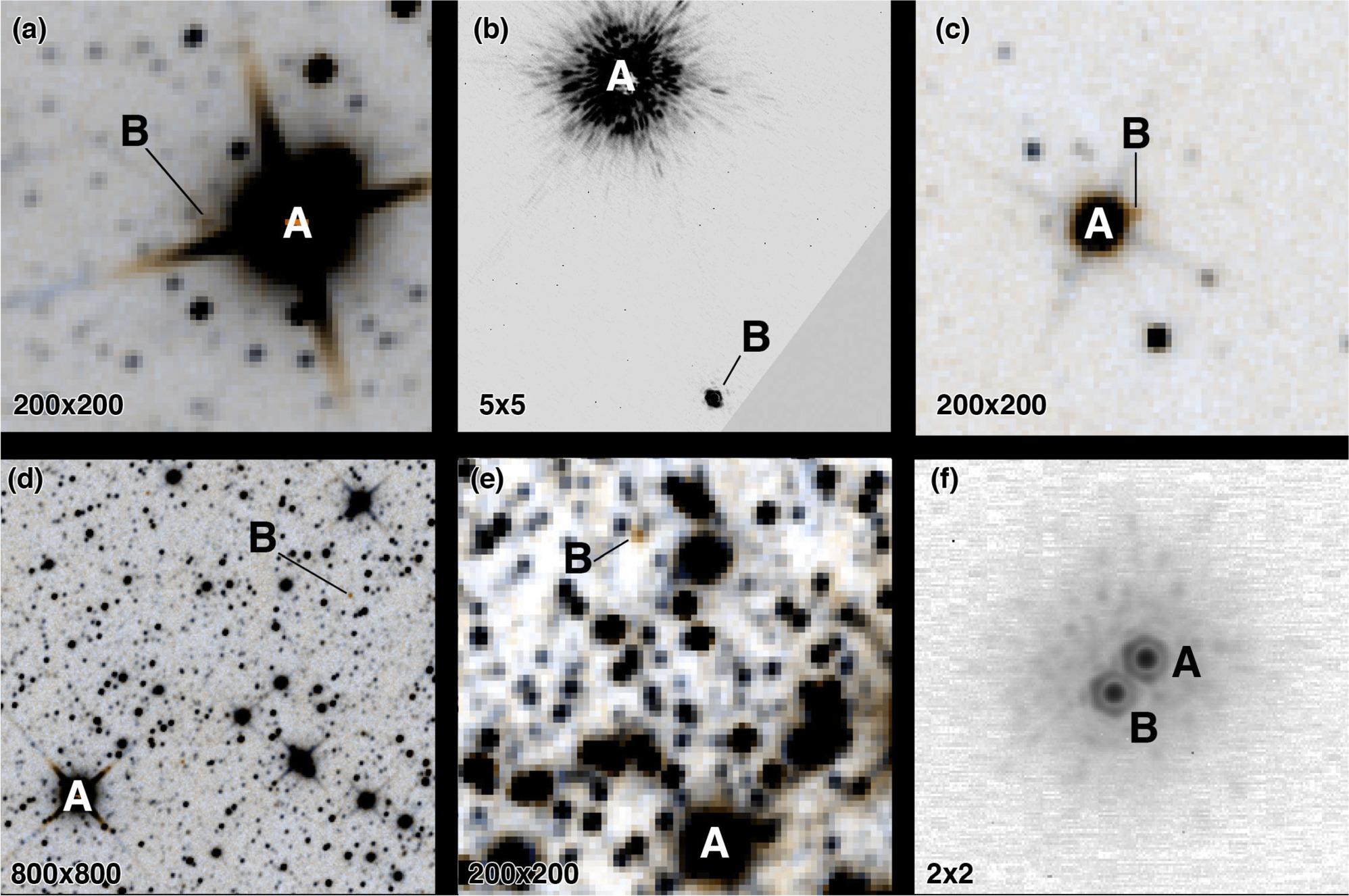 Images illustrating the six new multiple systems discussed in the text. Each image has north up and east to the left, and the size of each (in arcseconds) is noted in the legend. (a) HD 13579 and CWISER J021550.96+674017.2, (b) HD 17230 and Gaia DR3 25488745411919488, (c) G 43-23 and WISEU J100241.49+145914.9, (d) HD 170573 and CWISE J183207.94−540943.3, (e) G 155-42 and CWISE J184803.45−143232.3, and (f) 2MASS J19253089+0938235 A and B. All panels show WISE W1+W2 images from WiseView, except for panel (b), which shows a Keck/NIRC2 K p -band image, and panel (f), which shows a Keck/NIRC2 K-band image.