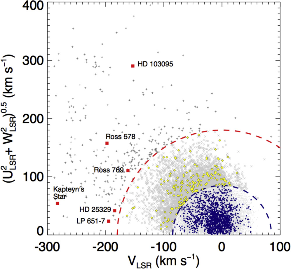 Toomre diagram of UVW space motions corrected to the local standard of rest (LSR) for 74,066 Gaia DR2 stars within 100 pc of the Sun and having parallax errors <10% (Kirkpatrick et al. 2021b). Thin disk (light gray dots), thick disk (medium gray crosses), and halo (dark gray pluses) objects are marked, with halo stars falling outside the outer dashed circle (red) and thin disk objects falling inside the inner dashed circle (navy). Objects with measured radial velocities in Table 4 or Table 14 are shown in navy if lying in the thin disk velocity zone, yellow for the thick disk zone, and red for the halo zone. The six halo members are highlighted with black labels.