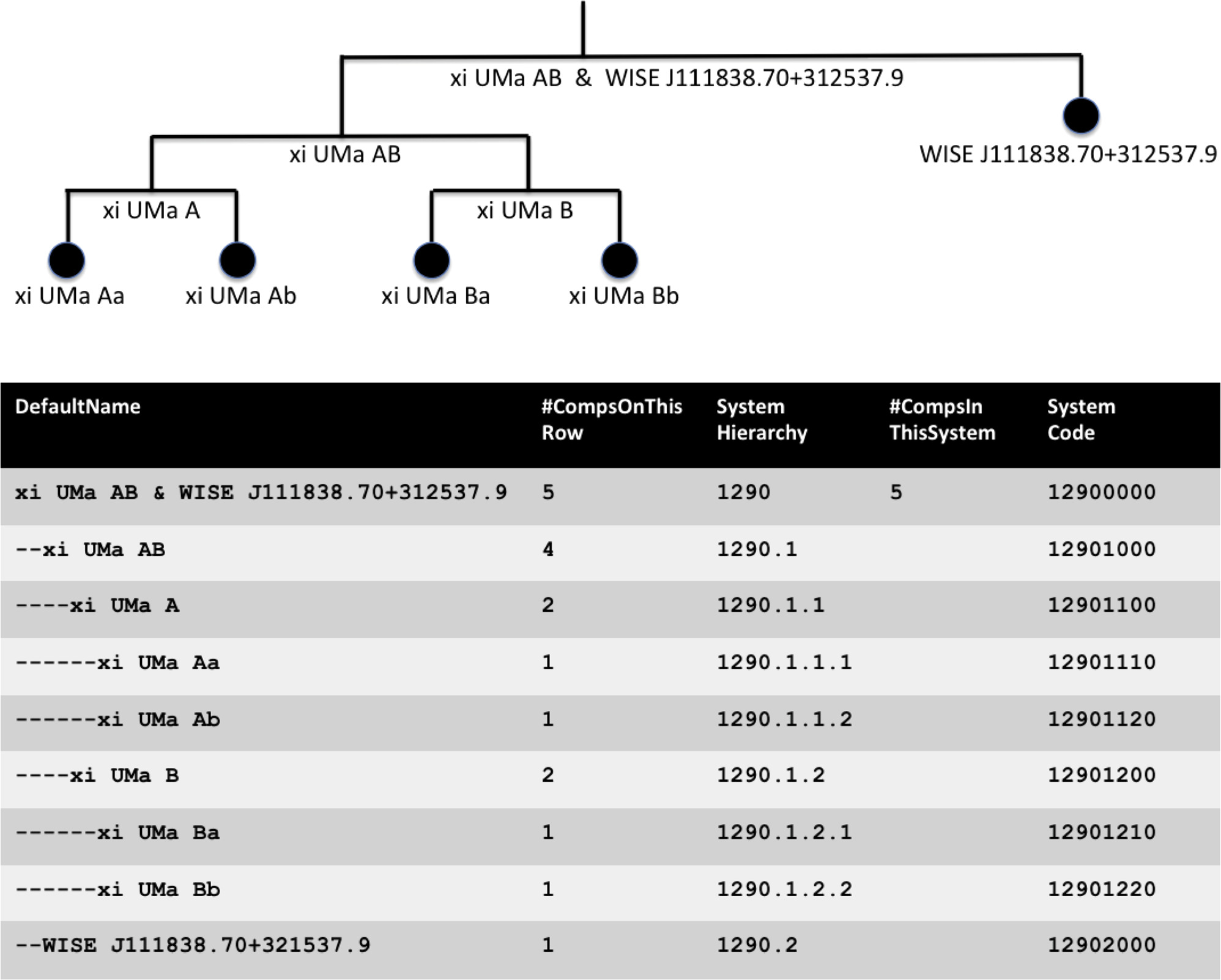Mobile diagram for the ξ UMa system along with sample columns from Table 4. The mobile diagram at top shows a stylized representation of this quintuple system, illustrating the pair of close doubles (ξ UMa A and ξ UMa B) and their distant common proper-motion companion (WISE J111838.70+312537.9). The table at bottom shows the nine rows for this system, representing the nine vertices (with labels) in the mobile diagram. Table 4 entries for DefaultName, #CompsOnThisRow, SystemHierarchy, #CompsInThisSystem, and SystemCode are shown for illustration.