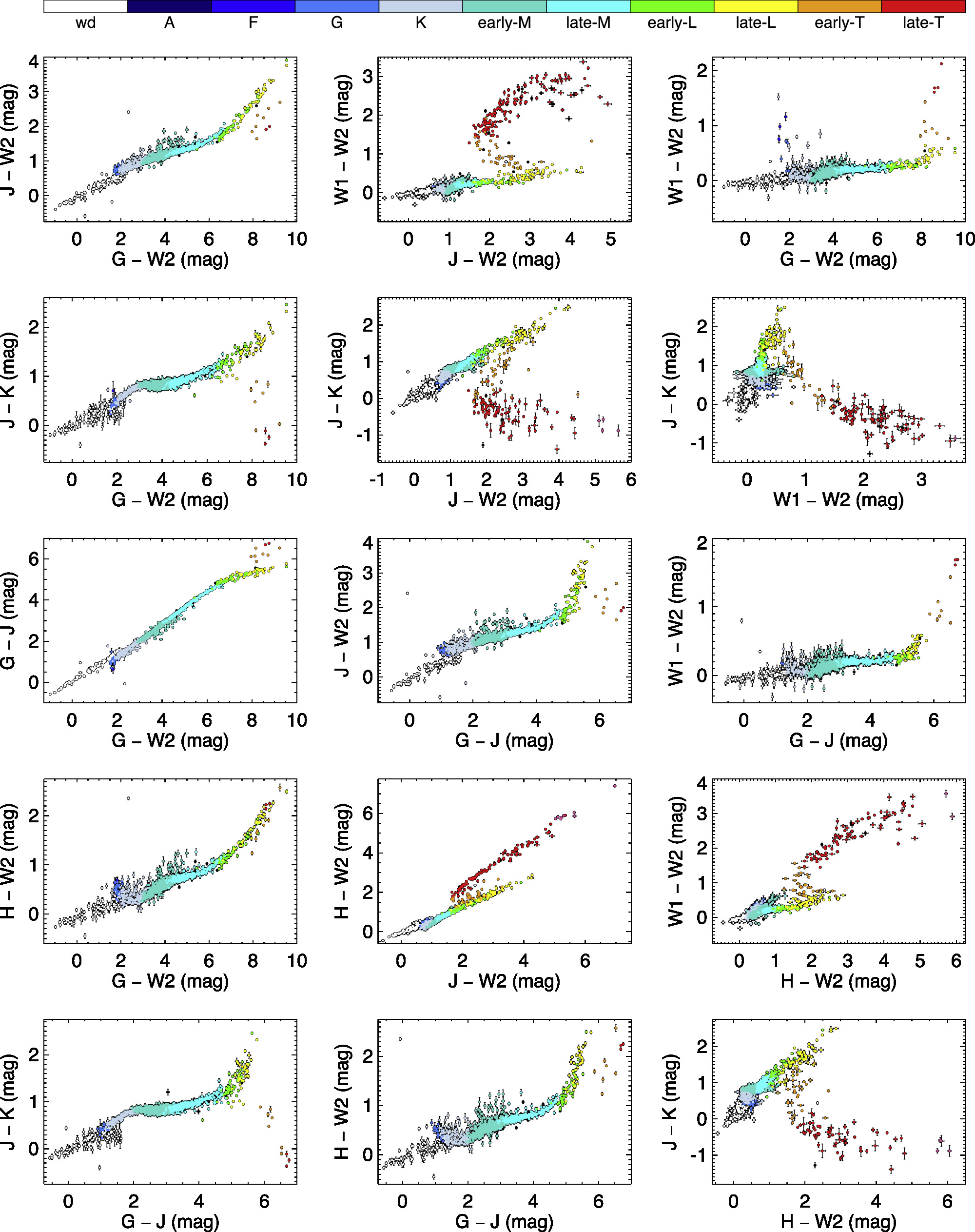 Various color–color diagrams for the 20 pc census. See text for details.