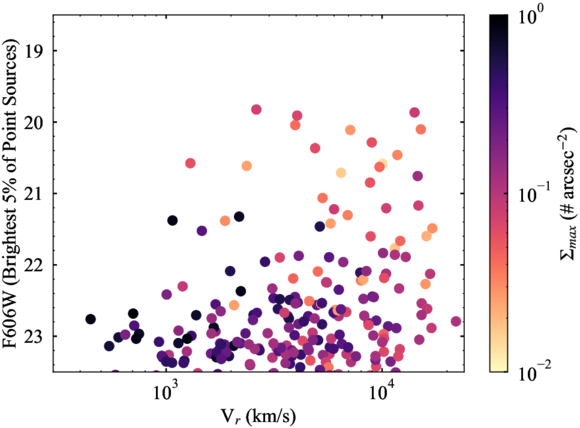 The apparent F606W magnitude of the brightest 5% of reliably measured stellar sources in each image, as a function of the recessional velocity of the system. Points are color coded by the maximum local stellar density of each system (Table D1). Images with low maximum densities are likely to consist of angularly small and/or poorly resolved targets, leading their brightest stellar sources to be either stellar clusters or foreground stars.