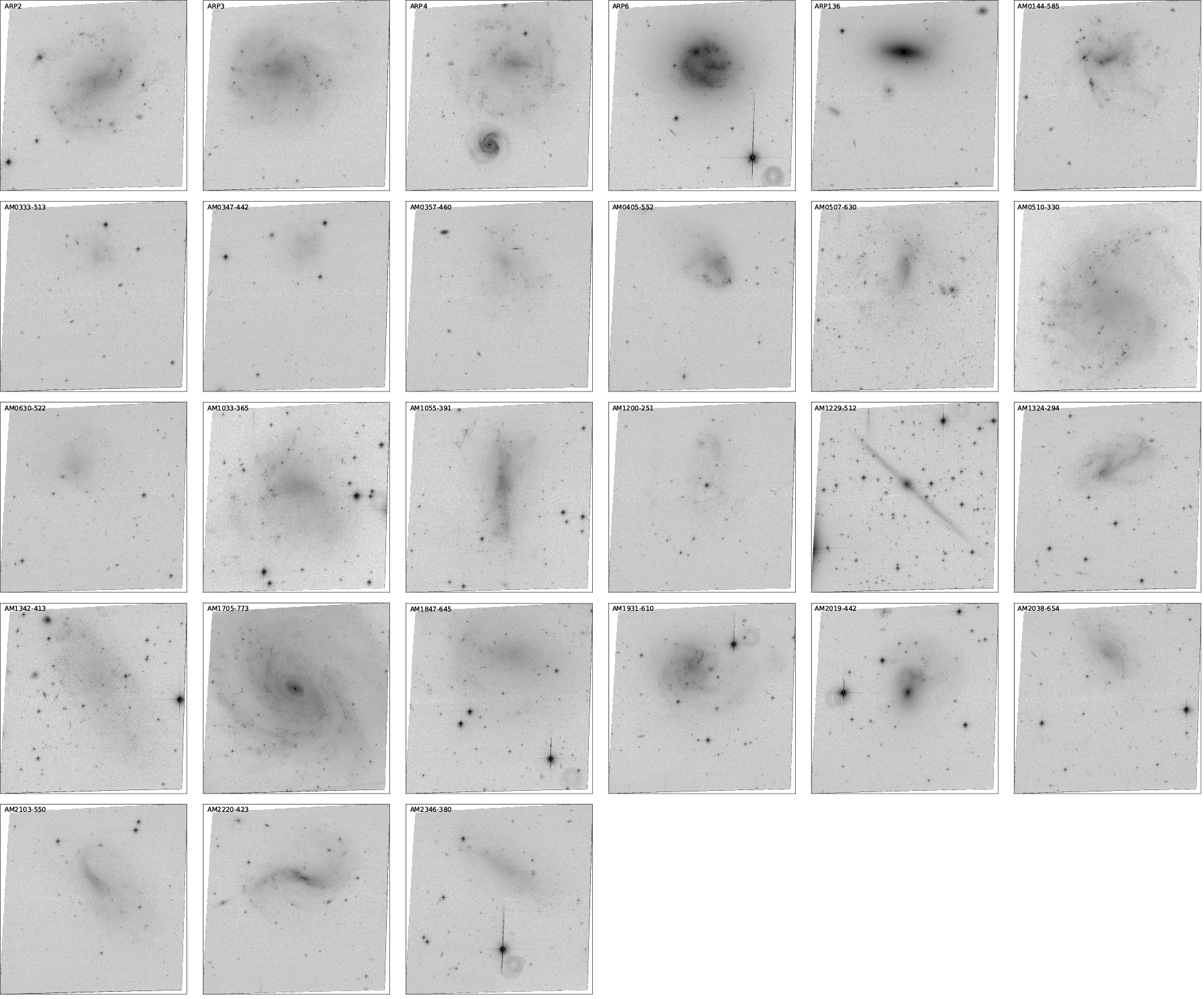 Thumbnails of low surface brightness galaxies: ARP2; ARP3; ARP4; ARP6; ARP136; AM0144-585; AM0333-513; AM0347-442; AM0357-460; AM0405-552; AM0507-630; AM0510-330; AM0630-522; AM1033-365; AM1055-391; AM1200-251; AM1229-512; AM1324-294; AM1342-413; AM1705-773; AM1847-645; AM1931-610; AM2019-442; AM2038-654; AM2103-550; AM2220-423; AM2346-380. While the main galaxies in Arp 136 and AM2019-442 are high surface brightness, in both cases, there is a foreground low surface brightness galaxy responsible for the neighboring diffuse emission.
