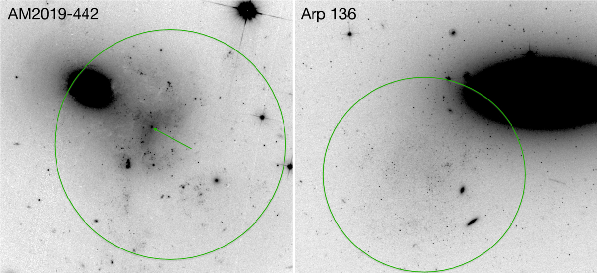 Zoomed, high-contrast views of two foreground low surface brightness dwarfs (left: AM2019-442, previously identified by J. Yadav et al. 2022; right: Arp 136) partially superimposed on background early-type galaxies whose morphologies and sizes suggest much larger distances, and thus no true physical association. Both foreground dwarfs have resolved point-source populations indicative of recent star formation, centered on a smooth, but low surface brightness, background of older stars. Open green circles indicate the approximate extent of the recent star formation in each galaxy, and the green arrow indicates a possible nuclear cluster candidate centered on the smooth background of older stars in AM2019-442’s foreground dwarf. The higher density and degree of clustering of point sources in the AM2019-442 dwarf suggest a higher SFR intensity than in the Arp 136 system. Notably, there is a rich network of structured dust obscuration against the background galaxy in AM2019-442, which suggests that this might be a favorable system for studying the cold ISM in a low surface brightness galaxy.