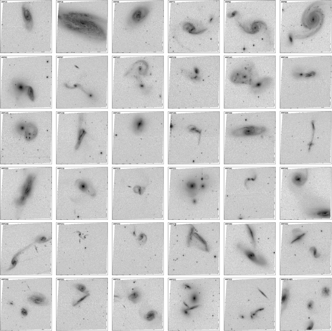 (a) Thumbnails of systems containing at least one galaxy with strong, red, central WISE W3+W4 point-source emission. All have detectable VLASS emission aligned with the WISE source if observed (δ > −40°), with the exception of Arp 82, AM1421-282, and AM2350-302, which were observed but had no visible radio emission in VLASS. Systems shown are ARP15; ARP18; ARP49; ARP72; ARP82; ARP86; ARP91; ARP97; ARP107; ARP126; ARP143; ARP144; ARP145; ARP158; ARP163; ARP195; ARP200; ARP204; ARP205; ARP216; ARP219; ARP221; ARP241; ARP245; ARP248; ARP251; ARP255; ARP278; ARP283; ARP293; ARP300; ARP301; ARP314; ARP321; ARP322; AM0018-485. (b) Thumbnails of systems containing at least one galaxy with strong, red, central WISE W3+W4 point-source emission. All have detectable VLASS emission aligned with the WISE source if observed (δ > −40°), with the exception of Arp 82, AM1421-282, and AM2350-302, which were observed but had no visible radio emission in VLASS. Systems shown are AM0135-650; AM0223-403; AM0313-545; AM0052-321; AM0459-340; AM0558-335; AM0642-801; AM0658-590; AM1214-255; AM1229-512; AM1255-430; AM1421-282; AM1440-241; AM1546-284; AM1957-471; AM2031-440; AM2038-382; AM2048-571; AM2105-332; AM2105-632; AM2159-320; AM2222-275; AM2258-595; AM2303-305; AM2339-661; AM2350-302; AM2350-410.