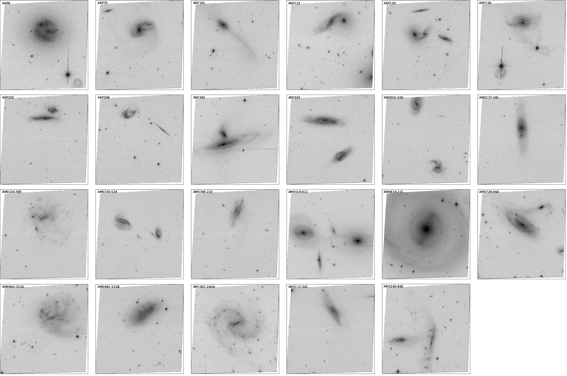 Thumbnails of systems containing at least one galaxy with moderate, red, central WISE W3+W4 emission, but weaker than Figure 23 and/or ambiguous evidence for being a point source. The galaxies with WISE W3+W4 emission that were observed with VLASS (north of δ = −40°) all have detectable VLASS emission aligned with the WISE source, with the exception of Arp 6, Arp 208, AM0942-313A, and AM1401-243A, which were observed but had no visible radio emission in VLASS. Systems shown are ARP6; ARP75; ARP101; ARP122; ARP150; ARP156; ARP202; ARP208; ARP282; ARP303; AM0001-505; AM0137-281; AM0144-585; AM0230-524; AM0346-222; AM0519-611; AM0619-271; AM0728-664; AM0942-313A; AM0942-313B; AM1401-243A; AM2113-341; AM2240-892.