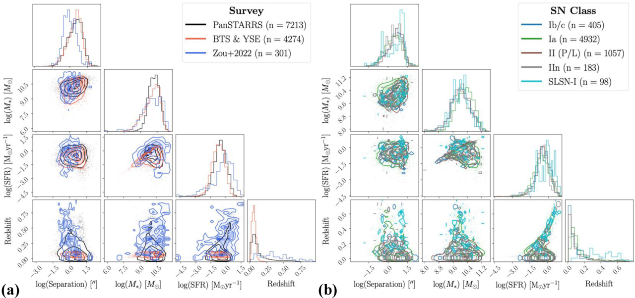 (a) The distributions of SN–host angular separation, stellar mass, SFR, and redshift for all hosts from the Pan-STARRS, the Bright Transient Survey (BTS), and the Young Supernova Experiment (YSE), and F. Zou et al. (2022) datasets. Note that the values for Pan-STARRS, BTS, and YSE are inferred by SPLASH while the values from F. Zou et al. (2022) are derived from their SED fits. (b) The distribution of inferred host properties for Type Ia, Ib/c, II, IIn, and SLSNe-I from the OAC with hosts in the Pan-STARRS dataset. We only include hosts with redshifts ≤1 because SPLASH does not classify SNe that are farther away. All histograms are normalized, and the number of hosts for each category (“n”) is included in the legends.