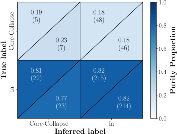 The cumulative Type Ia vs. CCSN confusion matrix across 20-fold stratified cross validation of SNe with hosts in the F. Zou et al. (2022) catalog. Each square in the grid shows the mean purity across folds, and the top and bottom triangles within each square correspond to the performance using NN-inferred and derived properties, respectively. The numbers of SNe in each category are included in parenthesis.