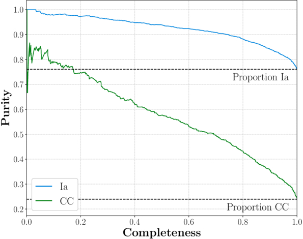Purity vs. completeness for SPLASH binary classification of SNe from the BTS and YSE catalogs.