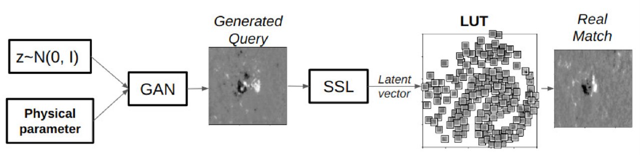 Graphical illustration of the designed and implemented solar image generation and retrieval pipeline. The process involves a generative model (GAN), and supervised learning to utilize physical parameter space for generation and manipulation of images, and self-supervised learning (SSL) for reverse real-image search. The lookup table (LUT) describes the mapping between an image and SSL-derived latent representation.