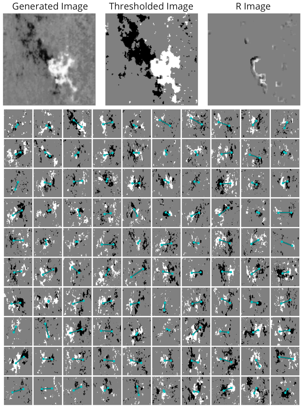 Calculation of physical parameters from thresholded GAN-generated magnetic patches. The top row shows a GAN-generated AR, its thresholded version, and the derived regions of polarity inversion with a high field gradient from left to right. The collage starting from the second row shows the thresholded version of all GAN-generated images in Figure 2 with field-strength-weighted centroids of positive and negative polarity connected by cyan lines.