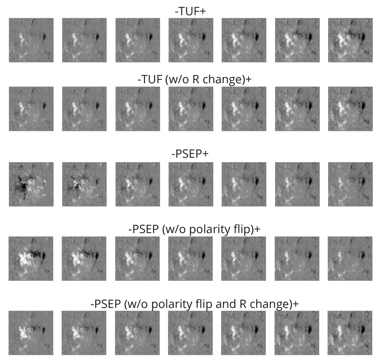 Manipulation of GAN-generated image along two different physically interpretable directions. Two directions are shown—total unsigned field (TUF; top two rows) and polarity separation (PSEP; bottom three rows). The second row from the top shows the result of decoupling TUF from the direction along which R changes. The fourth row shows the result of decoupling PSEP from the direction along which polarity is flipped and the bottom row shows the result of decoupling PSEP from both a polarity flip and change in R.