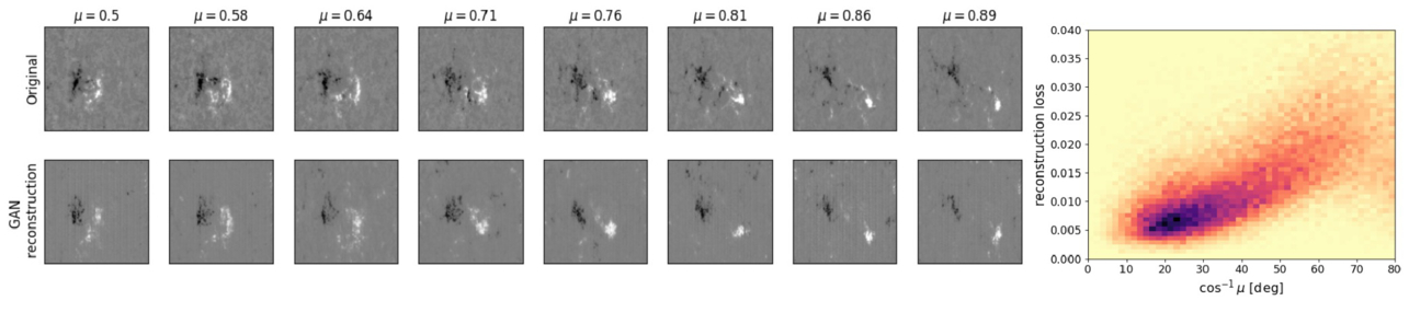 Result of GAN approximation (bottom row) of real images (top row) as a function of AR center heliocentric angle (﹩{\cos }^{-1}\mu ﹩). The two-dimensional histogram in the right panel shows that the reconstruction loss (i.e., the mean squared error between real and GAN-approximated images) increase when the AR moves toward the solar limb.