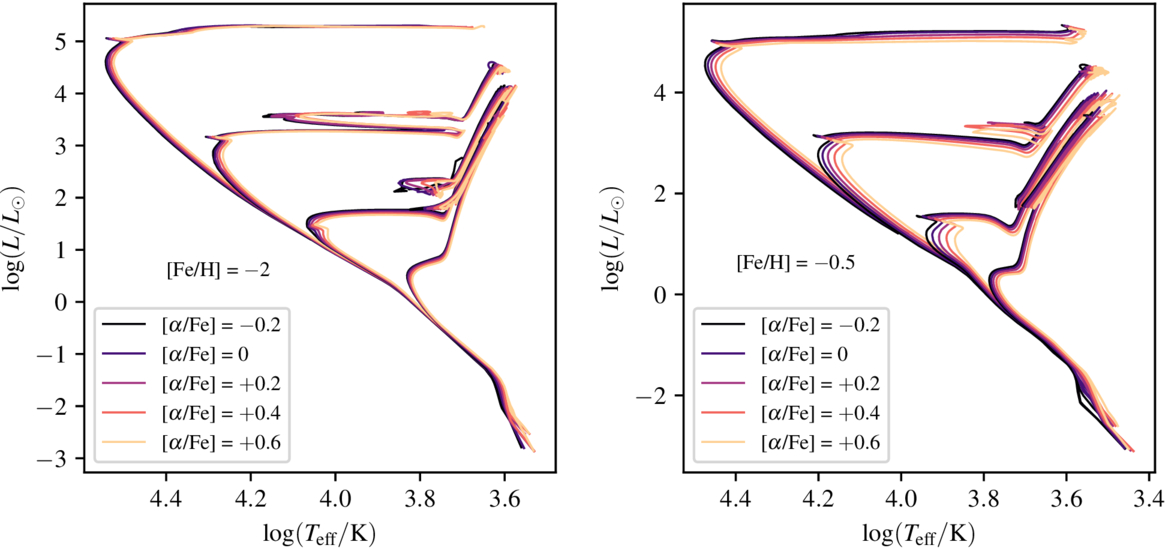 MIST isochrones at 10 Myr, 100 Myr, 1 Gyr, and 10 Gyr, showing the effect of [α/Fe] enhancements across the range −0.2 to +0.6 in the theoretical H-R diagram. The left panel shows [Fe/H] = –2.0 and the right panel shows [Fe/H] = –0.5 isochrones.