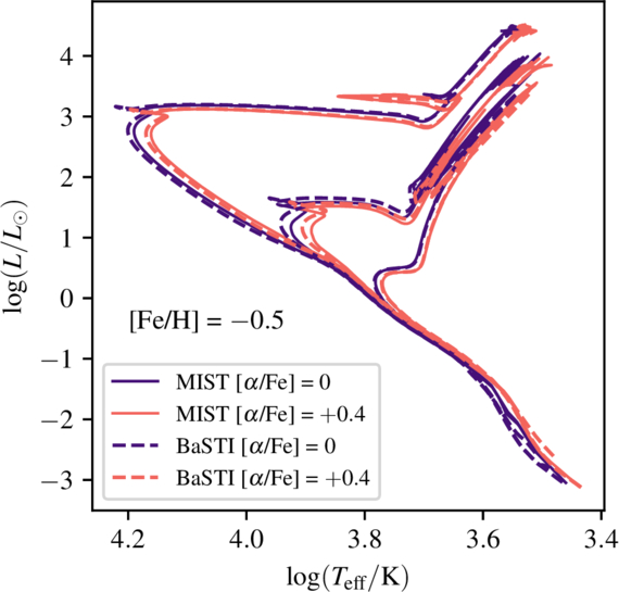 Isochrones at 100 Myr, 1 Gyr, and 10 Gyr from MIST (solid lines) and BaSTI (dashed lines). Darker colors show solar-scaled [α/Fe] = 0 isochrones, while lighter colors show [α/Fe] = +0.4 enhanced isochrones.