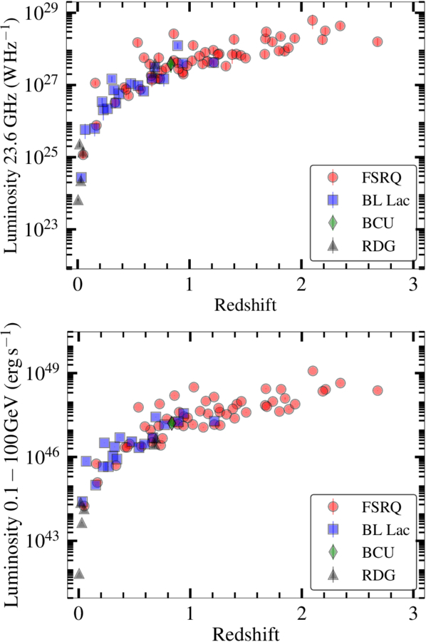 Radio luminosity at 23.6 GHz as a function of redshift (top panel) and gamma-ray luminosity as a function of redshift (bottom panel).