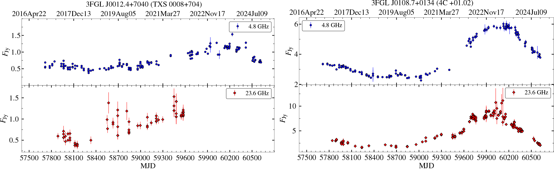 Example of light curves of the sources monitored by the SMMAN program at 4.8 GHz and 23.6 GHz.