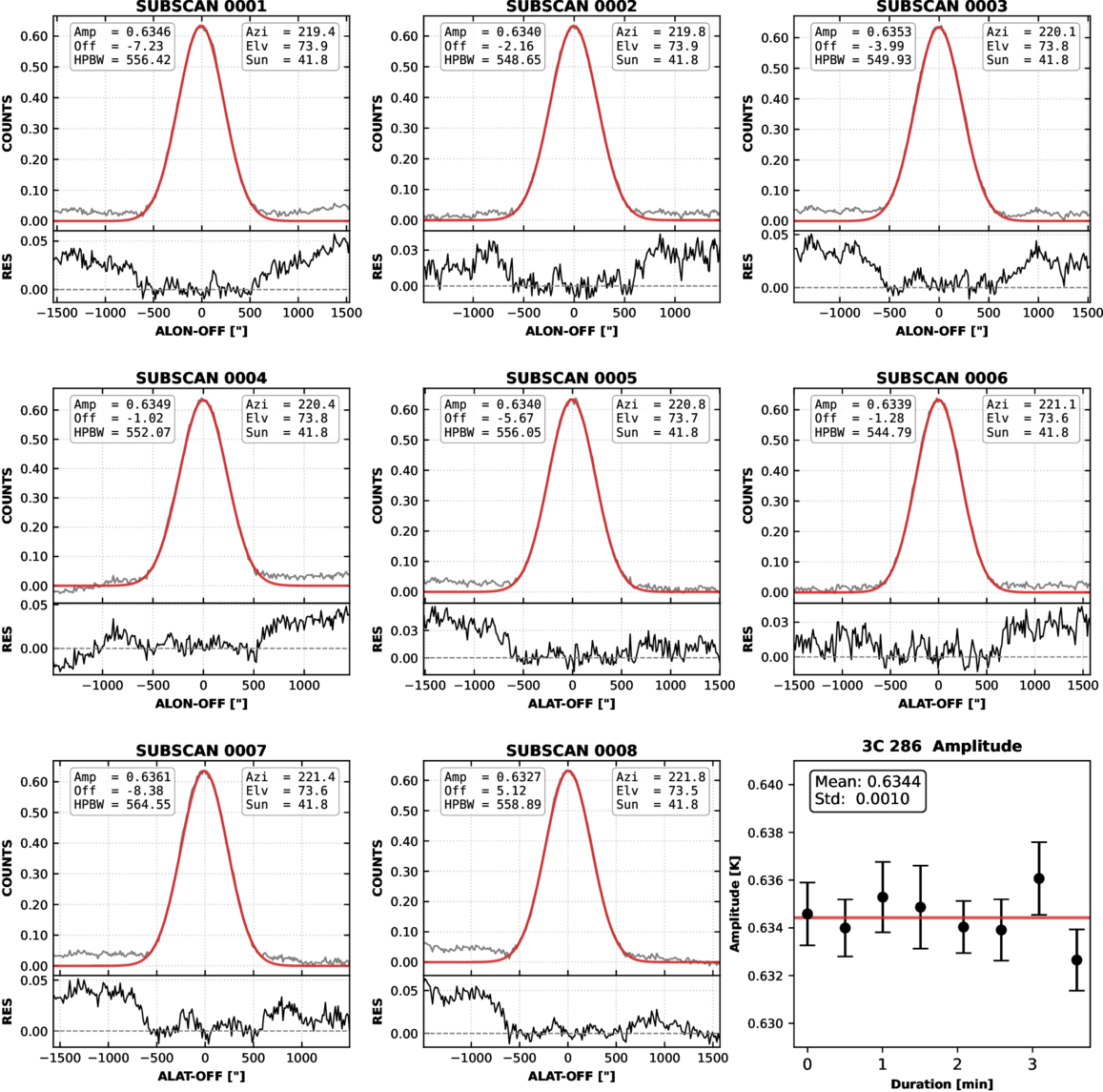Example of a 4 + 4 cross-scan observation of the calibrator source 3C 286 at 4.8 GHz. The first four subplots display longitude (azimuthal) subscans, followed by the next four showing latitude (elevational) subscans. For each of these eight subplots, the upper panel presents the subscan results, with the red curve representing the Gaussian fit model and the gray line indicating the actual observed data. The lower panel beneath each subscan plot shows the residuals of the model fit. The final subplot summarizes the fitted Gaussian amplitudes from all individual subscans, with a solid red horizontal line indicating the mean amplitude.