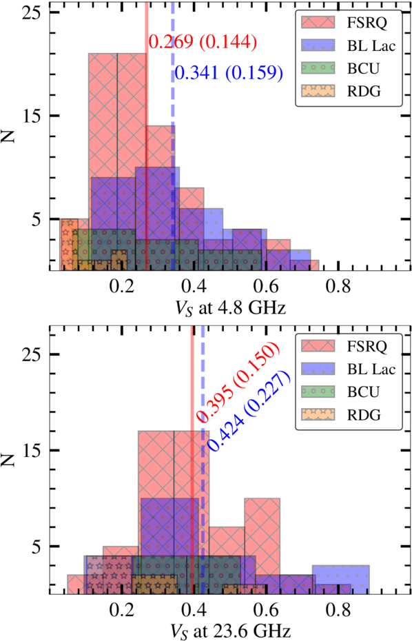 Histogram of the variability index at 4.8 GHz (top panel) and 23.6 GHz (bottom panel). The objects have been categorized according to their AGN classification type. The transparent solid red and dashed blue vertical lines represent the average values with standard deviation inside parentheses for FSRQs and BL Lacs, respectively.