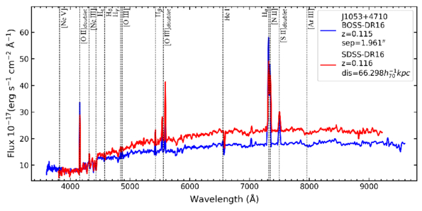 Comparison of SDSS and BOSS spectra for the dual-AGN system J1053+4710. Major emission lines are marked with vertical dashed lines, and the basic properties of the two components are shown in the upper-right corner.