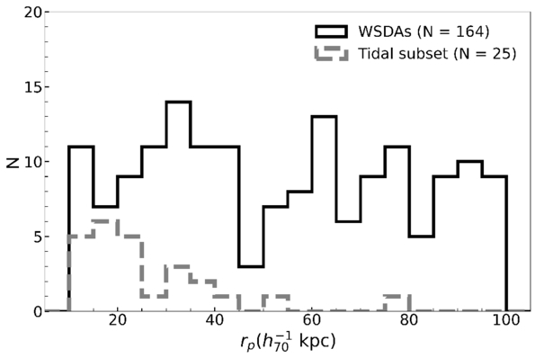 Distribution of projected distance (rp) for our dual AGNs. The black solid stepped histogram represents the full WSDA sample (N = 164), while the gray dashed stepped histogram corresponds to the tidal subset (N = 25).