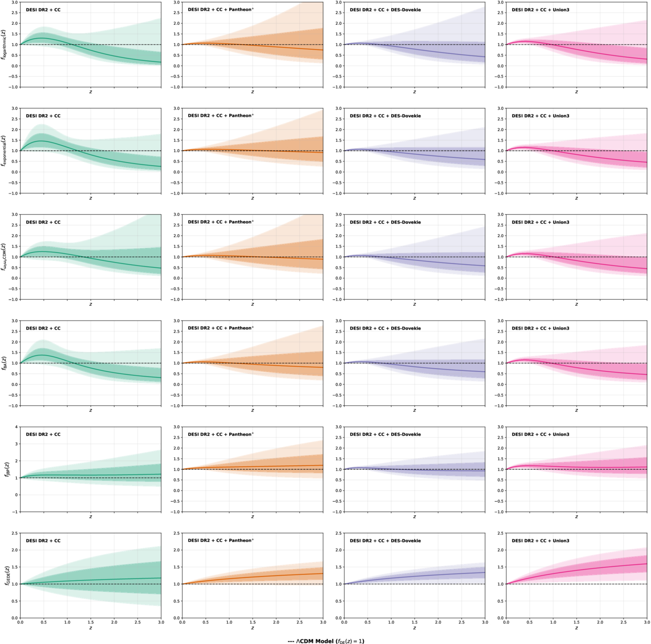 This figure shows the evolution of the energy density fDE(z) as a function of redshift, using DESI DR2 with CC measurements and different SNe Ia catalogs (Pantheon+, DES-Dovekie, and Union3).