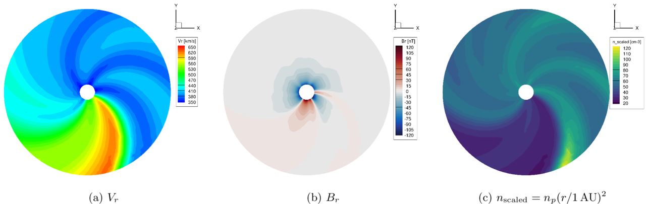 Equatorial-plane contours for the quasi-steady inner-heliospheric solar-wind case (2019 July 2, Carrington rotation 2219) using a P2 FR discretization on a mesh comprised of 25,600 elements.