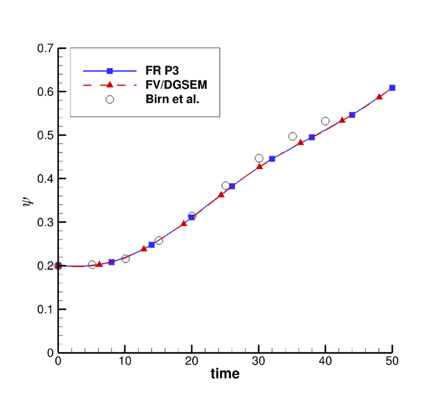 Reconnected flux for the GEM reconnection challenge as a function of time obtained with P3 FR in comparison with data from J. Birn et al. (2001) and the FV/DGSEM method in A. M. Rueda-Ramírez et al. (2021).