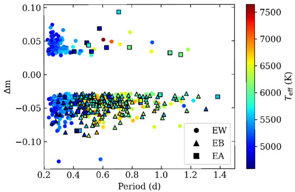 Variation of Δm with orbital period and Teff.