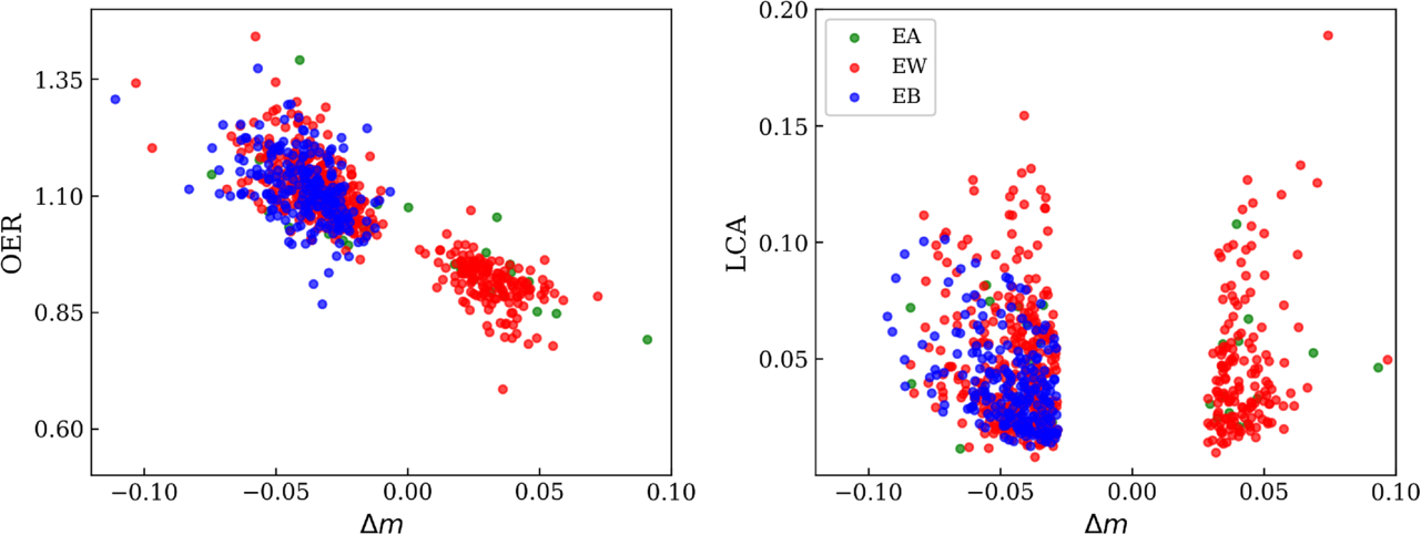 Left: Relationship between OER and Δm. EWs exhibit a relatively compact distribution, EBs also display a tight clustering, while EAs are fewer in number and more scattered. Right: Relationship between LCA and Δm. All three types are mainly concentrated in the low-LCA region (<0.1).