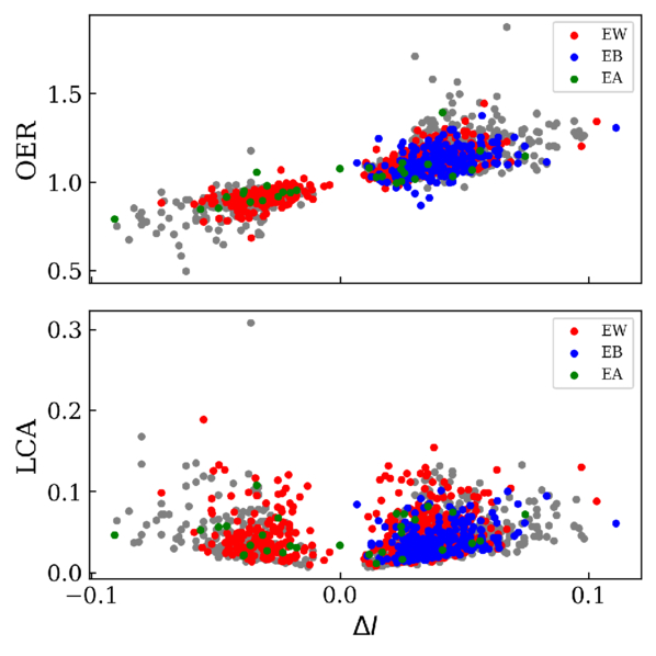 Scatter plot of LCA and OER versus ΔI. Gray points represent 779 W UMa systems of K25.