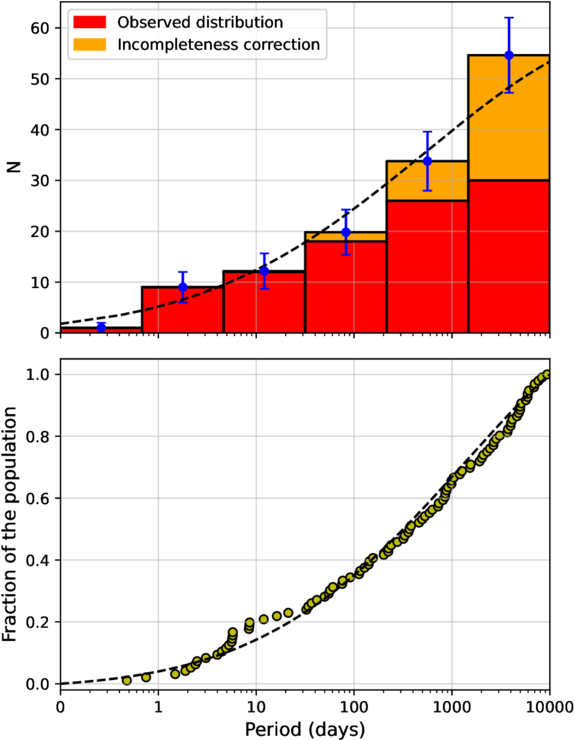 Top: distribution of orbital periods for the 96 binary members of the Hyades cluster with P ≤ 104 days. The optimal number of bins was determined following the Freedman–Diaconis rule. Error bars on the corrected distribution are from counting statistics, and the dashed line is the log-normal distribution for solar-type binaries in the field, from the work of D. Raghavan et al. (2010). Bottom: cumulative distribution function of observed periods, compared against the same field distribution as above (dashed line; see the text).