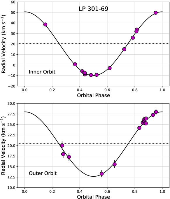 RV measurements for LP 301-69, together with our models for the inner and outer orbits. In each case, the motion in the other orbit has been subtracted for display purposes. The dotted line represents the center-of-mass velocity.