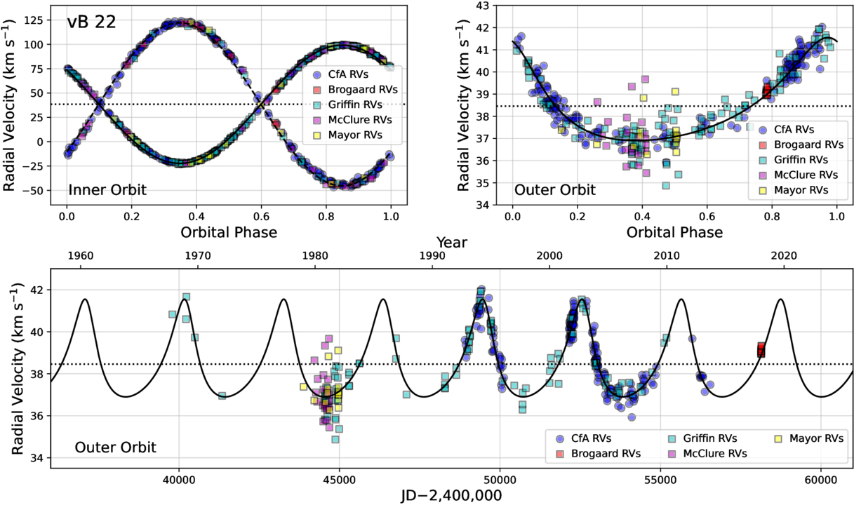 RV measurements for vB 22 together with our models for the inner and outer orbits (phase-folded plots in the top panels; see the text). Each panel has the motion from the other orbit subtracted. The bottom panel shows the outer orbit as a function of time. The center-of-mass velocity of the triple system is indicated with the dotted lines.