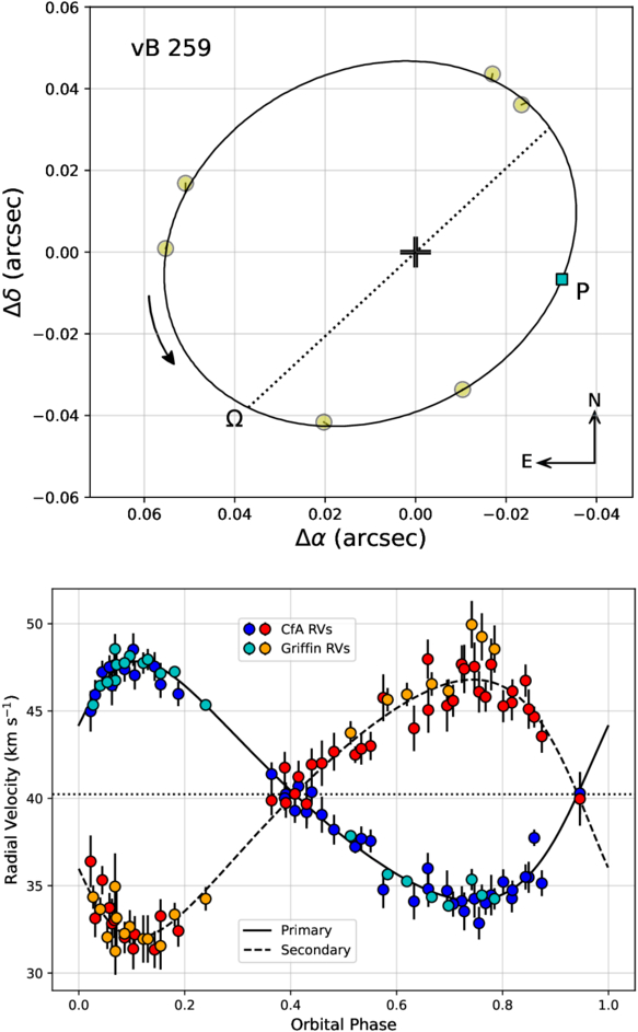 Top: astrometric observations of vB 259 together with our model for the orbit. Periastron is marked with a square and labeled “P”. The dotted line represents the line of nodes, with the ascending node labeled Ω. Bottom: RV measurements together with our model for the spectroscopic orbit. The center-of-mass velocity is indicated with the dotted line.