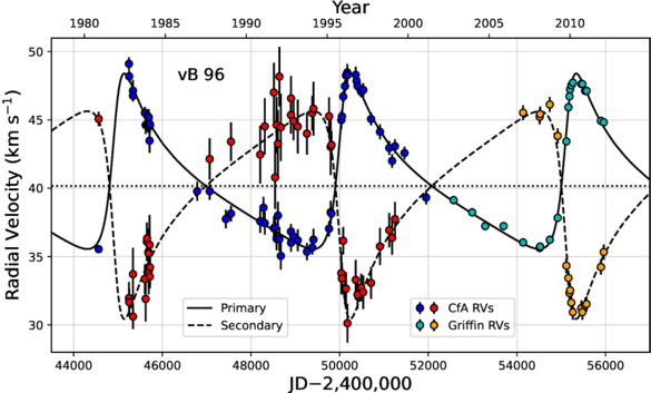 RV measurements for vB 96, along with our best-fit model. The dotted line marks the center-of-mass velocity.