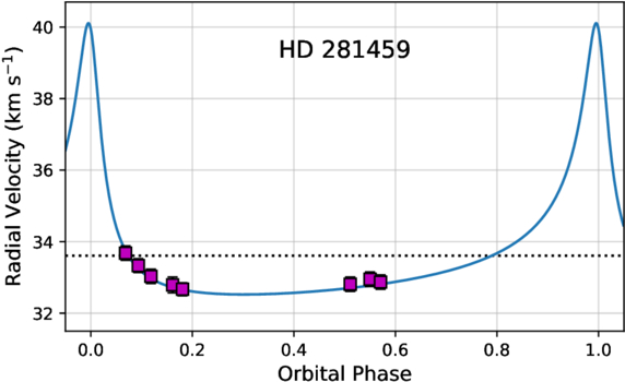 Our RV measurements for HD 281459, shown against the spectroscopic orbit from the Gaia DR3 non-single star solution. RV uncertainties are typically smaller than the symbol size.